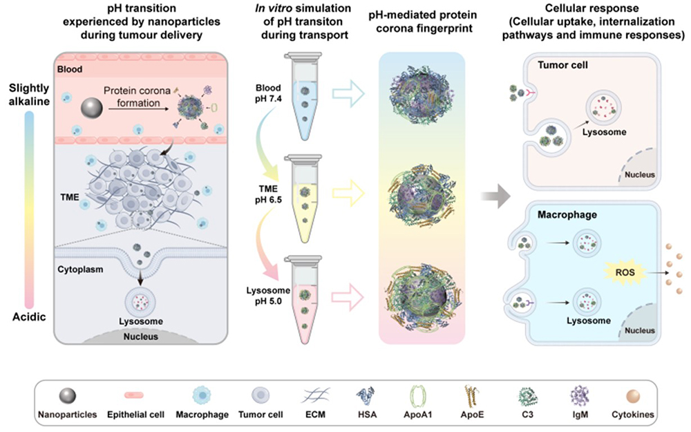 图2.生理pH变化对蛋白冠演化及其介导的细胞摄取和炎症反应的调控作用