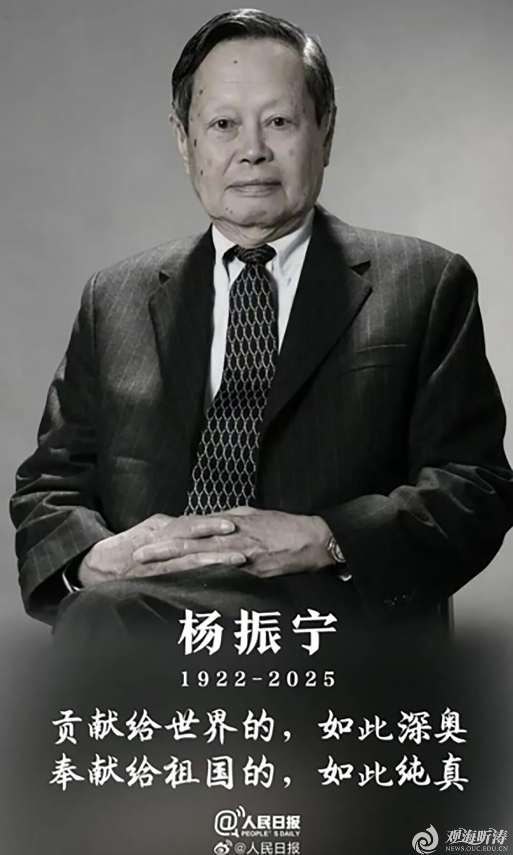 本站讯 10月18日,享誉世界的物理学家、诺贝尔物理学奖获得者,中国科学院院士,清华大学教授、清华大学高等研究院名誉院长杨振宁先生在北京逝世,享年103岁。这位将毕生奉献给科学事业与祖国科教发展的泰斗,其所留下的精神财富与殷切嘱托,必将如明灯般长亮,指引海洋学子砥砺前行。
