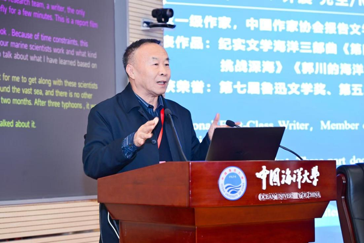 著名作家、山东省作家协会原副主席许晨围绕“蛟龙探海与海洋文学”主题分享其对海洋文学创作与实践的深刻思考。他首先结合自己随“蛟龙号”科考团队出海两个月的亲身经历,描述了航行的艰险体验,强调作家只有深入现场、与科学家共同生活,才能获得真实的创作素材与情感体验。许晨还重点介绍“蛟龙号”深潜器的研制背景与科学价值,阐释深海生命循环系统的独特性,认为“蛟龙号”的成功不仅拓展人类对海洋的认知,更使中国在国际海底矿区勘探中赢得重要权益,为国家长远发展奠定基础。