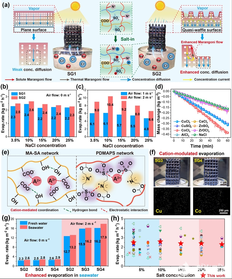 对三种打印针头定制打印路径,采用多层叠加的方法对其三维结构进行了建模,设计了平面表面和华夫格表面。具有华夫格图案的表面和多尺度分层孔隙的晶格结构显著增加了有效蒸发面积,能更好地利用阳光、气流和环境能量。两性离子的引入在海水中产生了显著的抗聚电解质效应,屏蔽了聚合物链段之间的相互作用,能暴露出更多的离子基团与水分子发生相互作用。二价阳离子的强溶剂化作用也削弱了水分子的氢键,破坏了原始的水分子结构。这些协同效应增加了中间水含量,从而加速了3D SGs的蒸发。在1个太阳和2 m s−1的风速下,3D SGs在海水中的最高蒸发速率达到17.9 kg m−2h−1,比相同条件下的淡水中的蒸发速率高出10.5%,是无风条件下的6倍,即使在25%的盐水中,蒸发速率仍能保持在6.6 kg m−2h−1,实现了广盐度范围(3.5−25%)条件下的稳定和高效水蒸发(图2)。