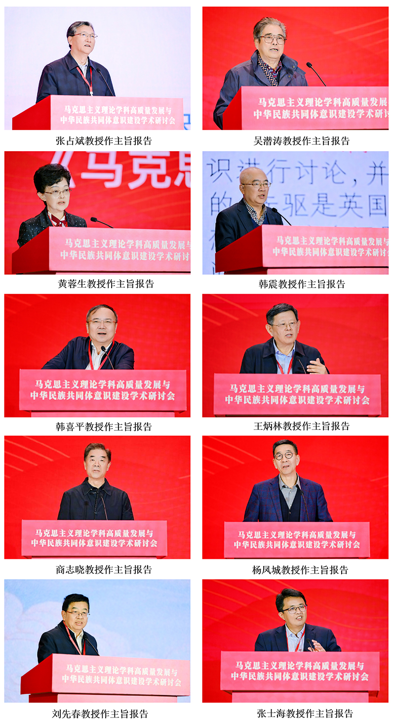 在主论坛报告环节,中共中央党校(国家行政学院)中国式现代化研究中心主任、国家哲学社会科学一级教授、国务院学位委员会学科评议组成员张占斌教授,清华大学首批文科资深教授、《社会主义核心价值观研究》主编吴潜涛教授,西南大学马克思主义理论研究中心主任、国务院学位委员会学科评议组成员兼召集人黄蓉生教授,北京师范大学学术委员会主任、中央马工程咨询委员会委员韩震教授,吉林大学党委副书记、国务院学位委员会学科评议组成员韩喜平教授,北京师范大学中共党史党建研究院院长、国务院学位委员会学科评议组成员王炳林教授,山东省高校当代中国马克思主义研究院院长、山东师范大学马克思主义学部商志晓教授,中国人民大学中共党史党建学院院长、国务院学位委员会学科评议组成员杨凤城教授,兰州大学中共党史党建研究院院长、教育部教指委委员刘先春教授,山东大学马克思主义学院院长、国务院学位委员会学科评议组成员张士海教授依次作了精彩发言。