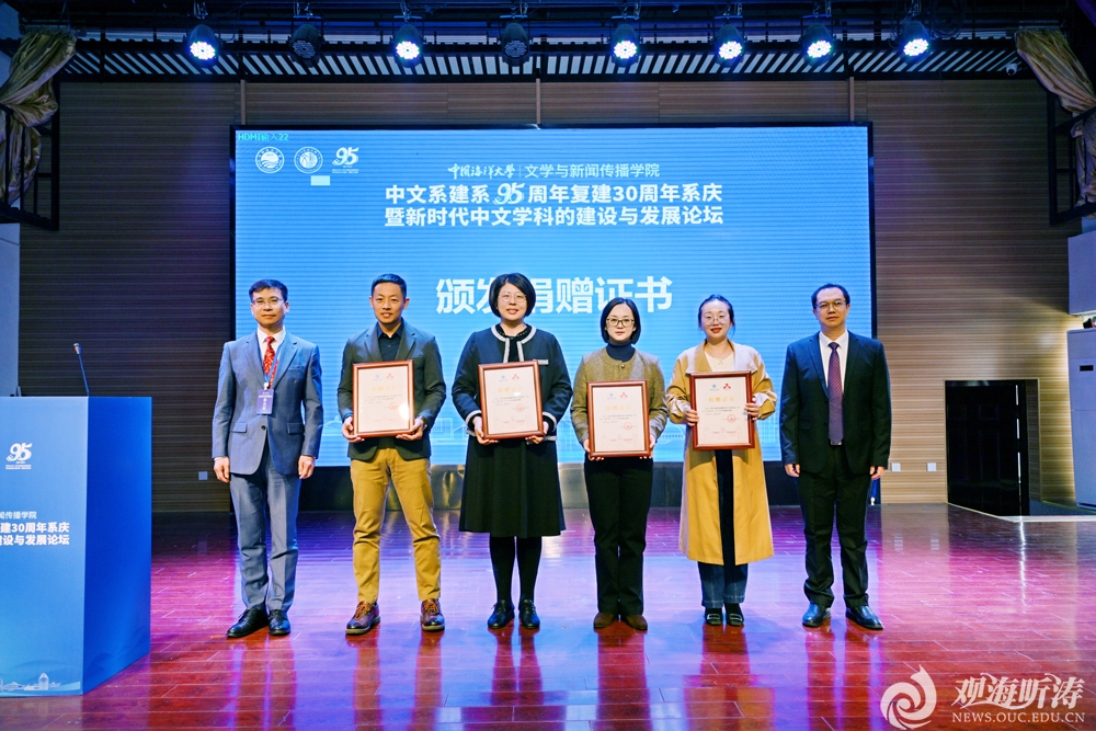 本站讯 10月25日,中国海洋大学文学与新闻传播学院中文系建系95周年复建30周年系庆大会在崂山校区举行。中国海洋大学副校长范其伟,吉林大学哲学社会科学资深教授、中国海洋大学特聘教授张福贵,厦门大学中国语言文学系系主任徐勇,校友代表、青岛黄海学院副校长梁忠环出席开幕式并致辞。