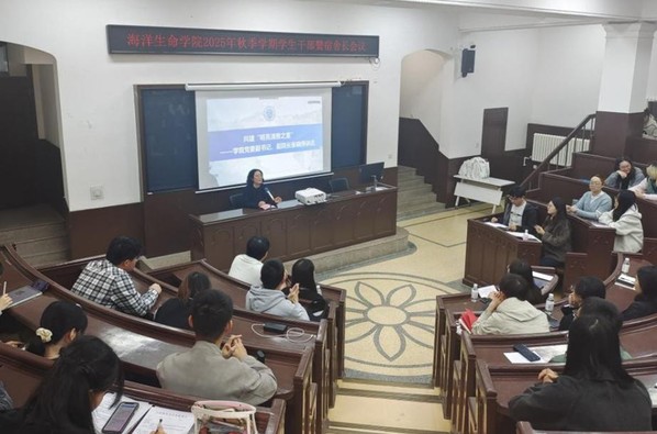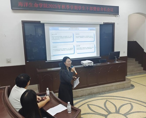 本站讯 为深入推进“一站式”学生社区建设,强化宿舍育人功能,营造安全、文明、和谐的宿舍环境,10月31日,海洋生命学院在科学馆K111教室举行2025年秋季学期学生干部暨宿舍长会议,同步启动第八届“明亮清雅之室”宿舍文化节。学院党委副书记、副院长张晓燕,学生社区服务中心鱼山校区管理部主任庄舒晴,生活辅导员田璐、张天奇,学院团委辅导员及全体班长支书、宿舍长、优秀宿舍代表等通过线上线下相结合的方式参加了会议。