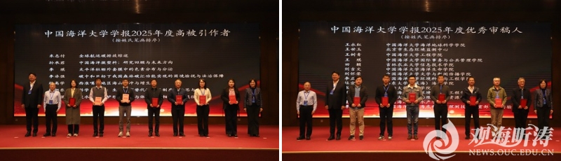 在表彰环节,出席会议嘉宾为21篇高被引论文作者颁发证书,授予14位学者“优秀审稿人”称号。学校副校长王厚杰、崂山实验室副主任吴能友、学校党委宣传部部长于淑华共同为获奖者颁奖。