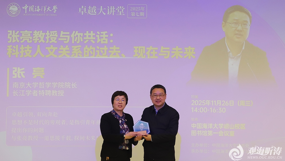 本站讯 11月26日,卓越大讲堂2025年第7期在崂山校区举办。本期活动以“科技人文关系的过去、现在与未来”为主题,特邀南京大学哲学学院院长、长江学者特聘教授张亮作专题报告。