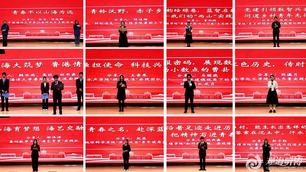 分享会设置“胸怀蓝色梦想”“勇立时代潮头”两个篇章,集中展现海大学子深耕专业实践、服务国家战略的奋进故事。在“胸怀蓝色梦想”篇章中,暑期赴港交流实践团成员分享了在中国香港开展高校参访、区情调研的收获,彰显鲁港青年同心致远的深厚情谊;水产学院“耕海牧渔”实践团王睿悉讲述了团队奔赴山东多地及越南,探索智能养殖、生态修复技术,助力海洋产业高质量发展的实践历程;海洋地球科学学院“深蓝攻坚”青年破局实践队成员赵蕊介绍了走访科研院所与产业一线,梳理国产海洋装备“卡脖子”技术清单、践行科技报国初心的攻坚故事;环境科学与工程学院“美丽中国・两山廿载”生态振兴先锋实践团代表曹雨桐分享了跨越六省十三市开展生态调研、科普宣讲的绿色实践;食品科学与工程学院“知行改革路,实践悟中国”实践队成员姚典鑫讲述了赴小岗村、青岛港等地研学,传承改革开放精神的感悟。