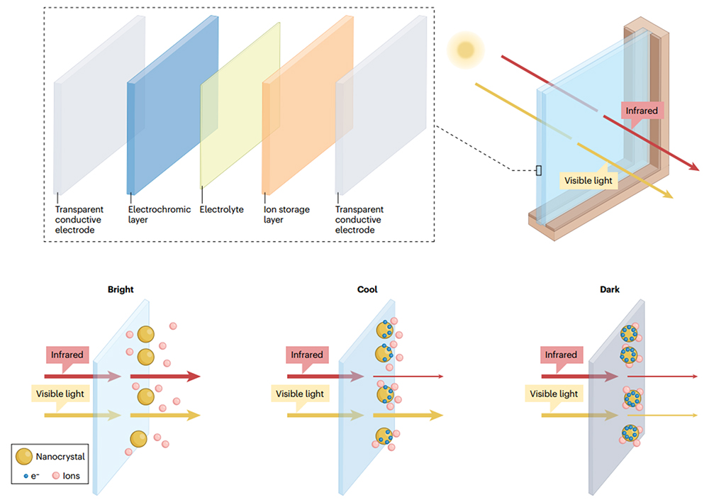 基于在光热调控电致变色智能窗领域的持续研究积累,课题组联合山东大学和加拿大阿尔伯塔大学等研究团队,全面讨论了无机电致变色智能窗(ESW)的工作模式、组装工艺和实施方法。该合作论文详细探讨了ESW能效、材料选择、电化学过程和光热调控性质之间的联系,指出在无机ESW中采用双波段调控与可逆金属沉积技术的优势,并强调了提高成本效益、规模化生产和长期耐久性等方面的重要性。相关综述论文以“Inorganic electrochromic smart windows for advancing building energy efficiency”(面向建筑能效提升的无机电致变色智能窗)为题发表于《自然综述·清洁技术》,中国海洋大学为通讯单位。