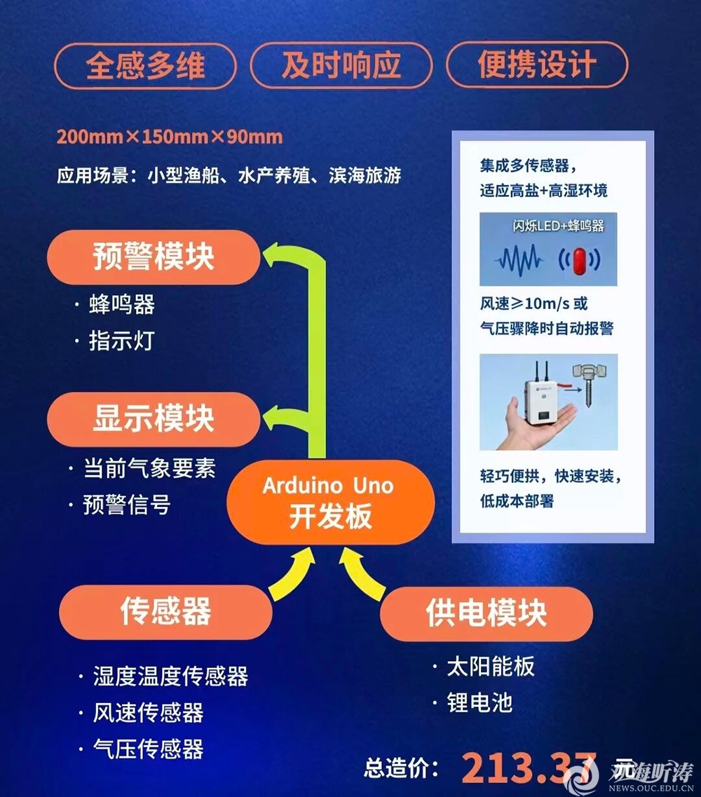 获奖作品《全感便携海洋气象预警器》紧密围绕海洋气象监测需求,创新融合多维感知与智能分析技术。该设备具备小巧便携、操作简便、响应迅速等优势,可实时监测关键气象要素,并通过智能算法实现快速预警,充分体现了团队在技术创新与实际应用方面的卓越能力。这份荣誉也彰显了学院在创新实践人才培养方面的扎实成效。