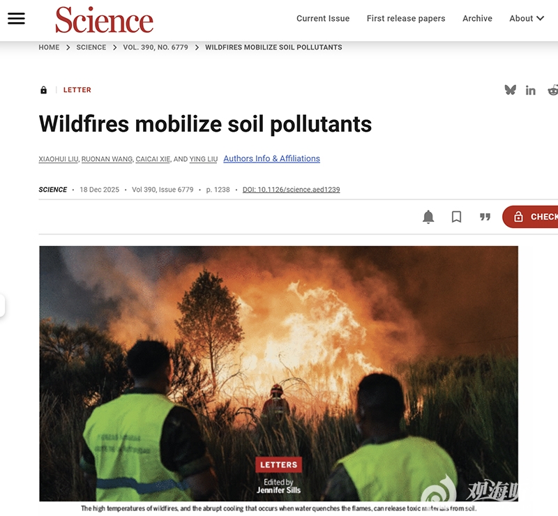 本站讯 12月18日,中国海洋大学以第一署名单位,环境科学与工程学院“青年英才工程”第三层次副教授刘晓晖为第一作者在国际顶级学术期刊Science(《科学》)的Letter专栏发表了题为“Wildfires mobilize soil pollutants”(野火释放了土壤中污染物)的文章。