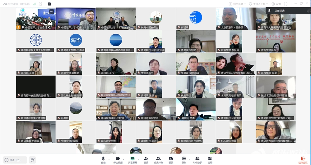 会议通过现场会、视频会相结合的方式同步召开,山东大学、江南大学、中国科学院天津工业生物技术研究所、青岛市产品质量检验研究院、青岛华大基因研究院、青岛海洋发展集团有限公司等42家单位的相关负责人参会。