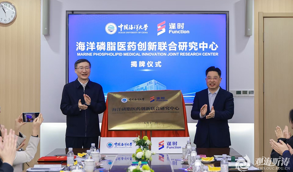 本站讯 2025年12月30日,中国海洋大学与逢时(青岛)海洋科技股份有限公司(以下简称“逢时科技”)共建的“海洋磷脂医药创新联合研究中心”签约暨揭牌仪式在逢时科技透明工厂举行。中国海洋大学校长张峻峰,逢时科技董事长高以成出席活动并共同为联合研究中心揭牌。