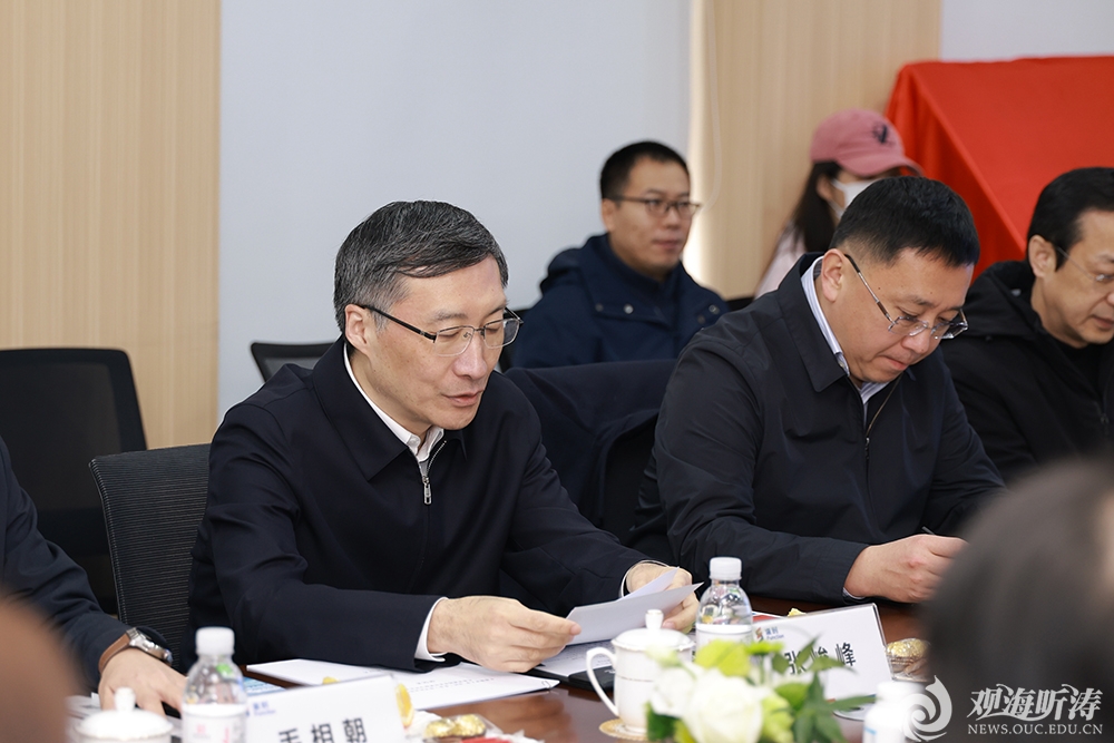 张峻峰与高以成共同为联合研究中心揭牌。中国海洋大学医药学院姜帅教授与逢时科技医药研发总监邓学鹏代表双方签署合作协议。联合研究中心主任姜帅教授汇报了中心的研究方向、管理模式和建设目标等工作内容,与会人员就下一步合作思路和推进机制进行了交流座谈。
