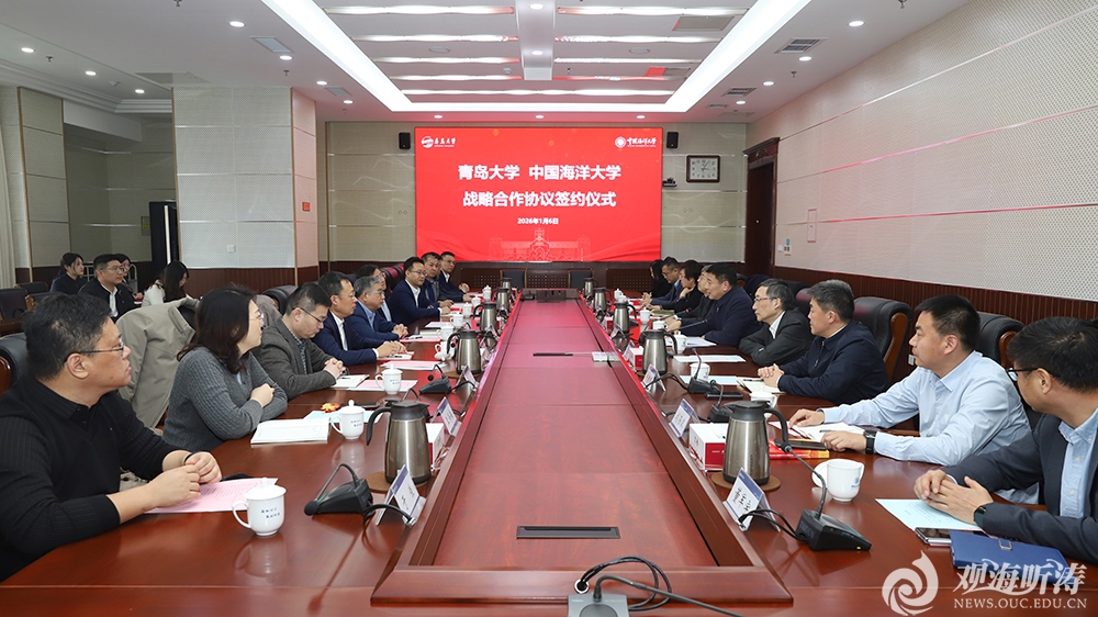 本站讯 近日,中国海洋大学与青岛大学战略合作协议签约仪式在中国海洋大学崂山校区举行。青岛大学党委书记胡金焱、校长魏志强出席仪式。中国海洋大学党委书记李明出席并致辞,校长张峻峰主持仪式。
