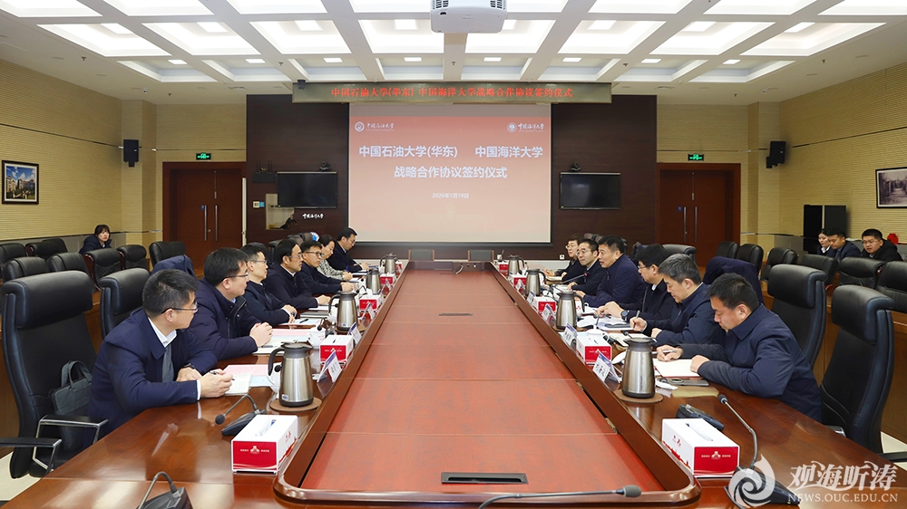 本站讯 1月19日,中国海洋大学与中国石油大学(华东)战略合作协议签约仪式在中国海洋大学崂山校区举行。中国石油大学(华东)党委书记吴强明,党委常委、副校长周鹏,党委副书记、纪委书记刘珂出席仪式。中国海洋大学党委书记李明,党委副书记、纪委书记俞黎阳出席仪式,党委常委、副校长王厚杰主持仪式。