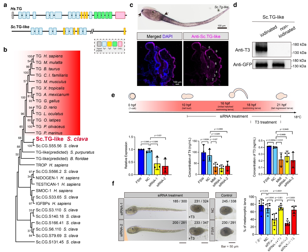 图1. 柄海鞘Tg-like基因的鉴定和功能验证。(a)人类TG蛋白和柄海鞘TG-like蛋白的结构域示意图。(b)柄海鞘TG-like蛋白与脊椎动物TG蛋白亲缘关系较近。(c)Tg-like基因在柄海鞘幼虫和成体内柱中的表达模式。(d)碘化实验证明TG-like蛋白为甲状腺激素合成提供激素生成位点。(e)敲降Tg-like基因后,柄海鞘体内甲状腺激素(T3和T4)水平下降。(f)敲降Tg-like基因后,柄海鞘幼虫尾部收缩受阻,外源性添加T3能够营救该表型。
