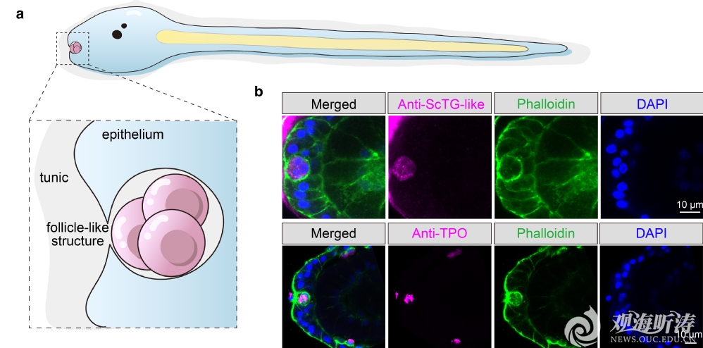 图2. 柄海鞘幼虫的类滤泡状结构。(a)类滤泡状结构的模式图。(b)甲状腺激素合成的基因表达于类滤泡状结构中。