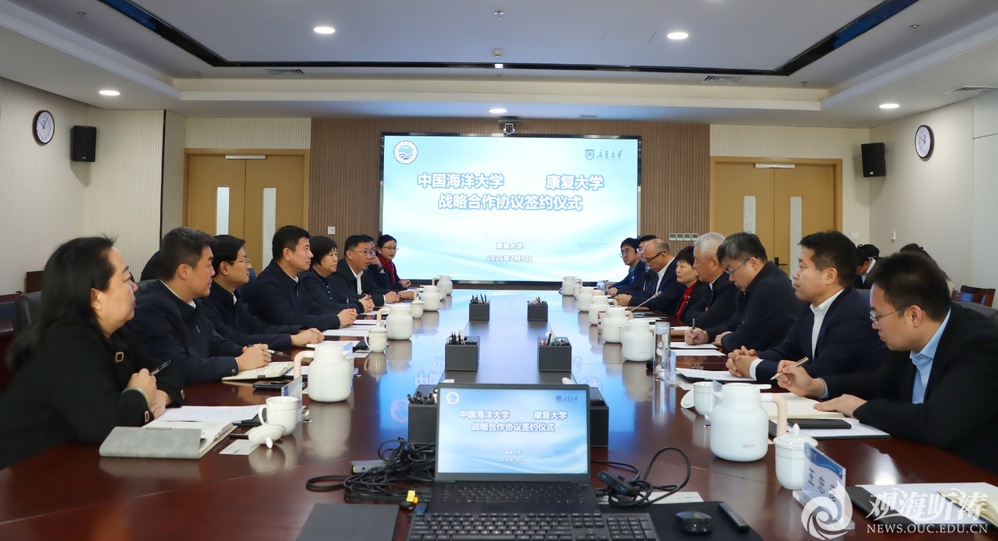 本站讯 2月9日,中国海洋大学与康复大学战略合作协议签约仪式在康复大学举行。康复大学校长、中国工程院院士董尔丹主持仪式,党委书记刘军,分管日常工作的副校长姜宏,副校长毕建国、刘奇迹出席仪式。学校党委书记李明、党委常务副书记张静、副校长王雪鹏出席仪式。