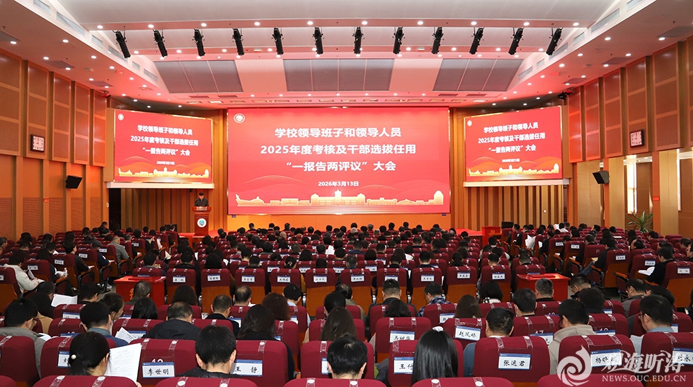 本站讯 3月13日,中国海洋大学召开学校领导班子和领导人员2025年度考核及干部选拔任用“一报告两评议”大会。党委书记李明主持大会,党委副书记、校长张峻峰代表学校领导班子作2025年度述职报告,党委常务副书记张静代表学校党委作2025年度干部选拔任用工作报告。
