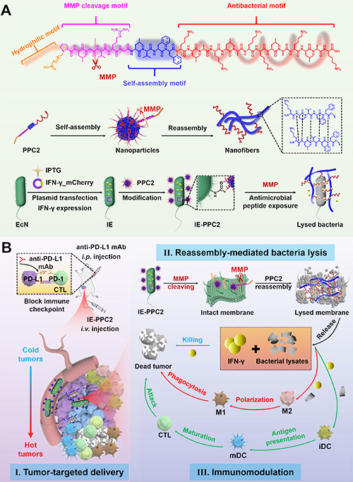 示意图展示了IE-PPCs系统的设计与作用机制。图A显示,由抗菌肽、MMP酶切肽、自组装基序(LVFF)和亲水性PEG组成的PPC2,在溶液中自组装为纳米颗粒,并通过酰胺键共价连接至经IPTG诱导表达IFN-γ的工程菌(IE)表面,形成IE-PPC2。图B则阐明了其在体内的三重级联作用:首先,IE-PPC2经静脉注射后主动靶向肿瘤部位;随后,在肿瘤高表达的MMP酶切下,PPC2发生重组装,从纳米颗粒转变为纳米纤维,暴露抗菌肽并特异性裂解IE菌,释放IFN-γ和细菌裂解物;最后,这些释放物协同作用,促进树突状细胞成熟和巨噬细胞向M1型极化,增强抗原提呈,并与抗PD-L1抗体联合阻断免疫检查点,共同将免疫抑制的“冷”肿瘤重塑为T细胞浸润的“热”肿瘤,从而实现高效、安全的抗肿瘤免疫治疗。