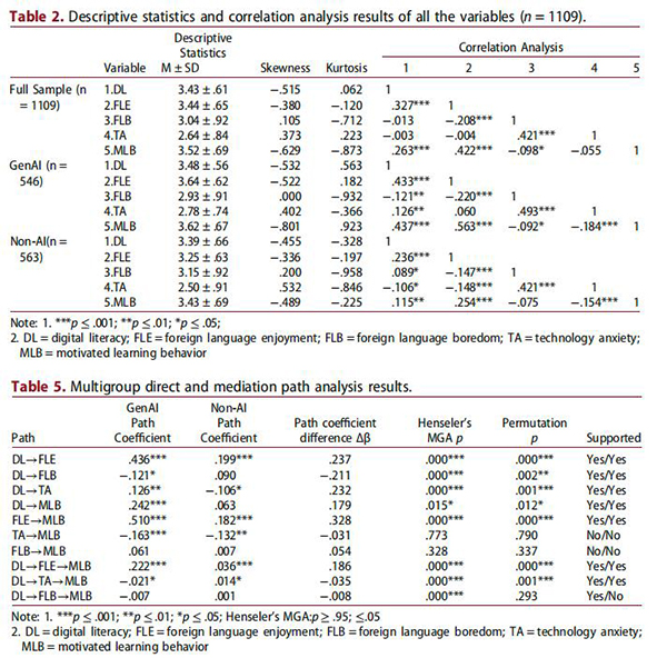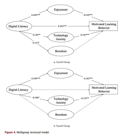 非正式数字英语学习日益成为二语习得的重要途径,生成式人工智能的介入极大提升了其交互性,但也给学习者的心理机制和数字素养带来了前所未有的挑战。探讨生成式人工智能支持下学习者认知、情感与动机行为之间复杂作用机制成为了当前国际二语习得研究的重点。目前,对于不同智能技术环境下学习者认知与情感机制的对比研究相对缺乏。本研究整合社会认知理论与控制价值理论,构建了非正式英语数字学习环境下的认知与情感双重驱动理论模型与具体假设模型,对学习者的多维心理变量进行了大规模对比研究。本研究受试为1109名中国高校英语学习者,被严格划分为生成式人工智能组与非人工智能组(表2),研究者运用偏最小二乘结构方程模型和多群组路径分析技术对所得数据进行数字素养、成就情绪与动机性学习行为的路径分析与统计分析。研究发现,一是在整体心理机制方面,“数字素养—外语愉悦—动机性学习行为”的正向链条得到显著验证,外语愉悦成为连接数字素养与学习投入的核心中介。二是在不同技术环境的差异化影响方面,多群组路径分析揭示了显著的群组异质性(表5,图4)。研究结果显示,生成式AI环境对该机制具有独特的增强效应,相较于非AI组,较高的数字素养不仅更强烈地促进了外语愉悦,更引发了技术焦虑的逆转轨迹。具体而言,在传统数字学习中,技术越熟练往往焦虑越低;但在GenAI环境中,较高的数字素养反而正向预测了适度的技术焦虑。这一独特的情感逆转发现,揭示了高素养学习者在面对AI复杂性时所产生的适应性动力,为理解大模型如何作为积极变量影响人类学习情绪提供了强有力的实证支撑,打破了传统环境中对数字焦虑的单一负面认知。