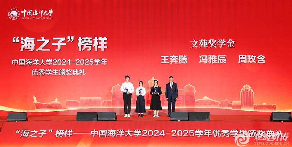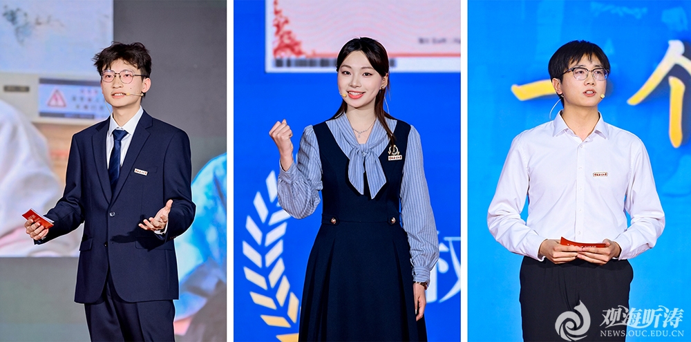 国家奖学金获得者代表、信息科学与工程学部陈星浩同学,工程学院“深海粮仓守卫者”团队王莉雯同学,文苑奖学金获奖代表、海洋与大气学院王奔腾同学,分别以“格物致知”“耕海牧渔”“逐浪而行”为主题,分享了他们奋楫争先、逐梦深蓝的青春故事。