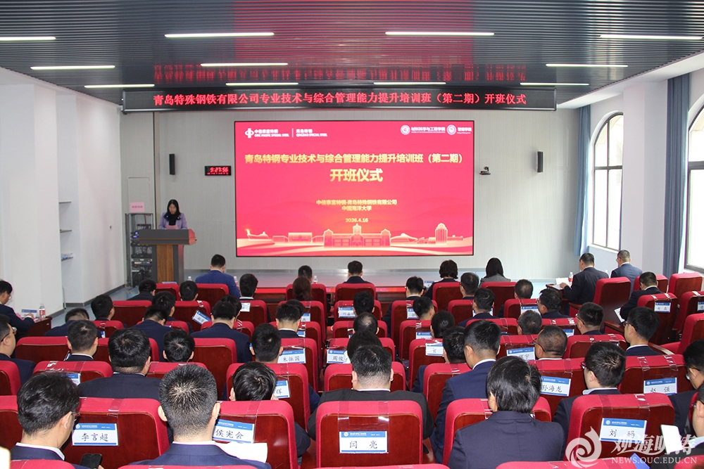 本站讯 4月16日上午,青岛特殊钢铁有限公司专业技术与综合管理能力提升培训班(第二期)开班仪式在中国海洋大学西海岸校区举行。青岛特钢党委书记、总经理孙广亿,中国海洋大学副校长王雪鹏出席仪式。