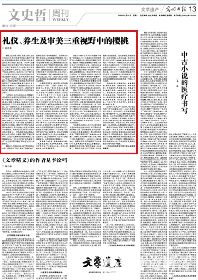 与此相应,至少从秦汉以来,樱桃就已成为朝廷宗庙祭祀的重要祭品。《吕氏春秋·仲夏纪》曰:“仲夏之月……天子以雏尝黍,羞以含桃,先荐寝庙。”这是说天子进献雏鸡和黍,并用先熟的樱桃首先祭祀宗庙。这一礼制在《礼记·月令》《淮南子·时则训》中也有大致相同的记载。《仪礼·士丧礼》“有荐新,如朔奠”,郑玄注:“荐五谷若时果物新出者”。《礼记·月令》“羞以含桃,先荐寝庙”,孔颖达疏:“按《月令》诸月无荐果之文,此独羞含桃者,以此果先成,异于余物,故特记之,其实诸果亦时荐。”也就是说,樱桃先熟,故“仲夏”进献,但进献宗庙的鲜果不只樱桃。樱桃作为“荐新”之果的具体起始年代,虽无法确定,但至少不会晚于战国晚期。考虑到《仪礼》所记礼仪有远古礼俗的影子,一种礼制的形成必然经历较长的历史积淀,以樱桃“荐新”可能还要更早。西汉时汉惠帝采纳叔孙通建议,“取樱桃献宗庙”,《史记》并说“诸果献由此兴”,这应是早期以樱桃“荐宗庙”的进一步制度化。