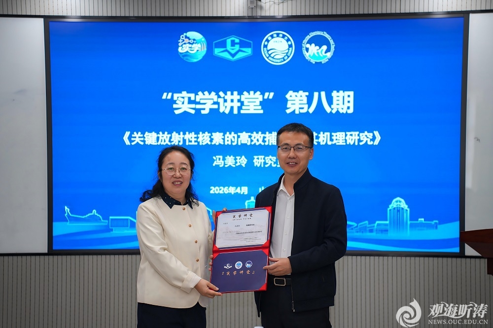 本站讯 4月19日上午,由中国海洋大学海洋化学理论与工程技术教育部重点实验室、化学化工学院主办的“实学讲堂”第八期活动在中国海洋大学化学化工学院多功能厅举行。活动邀请到中国科学院福建物质结构研究所冯美玲研究员作题为《关键放射性核素的高效捕获及其机理研究》的学术报告。报告由中国海洋大学化学化工学院孟祥超教授主持。