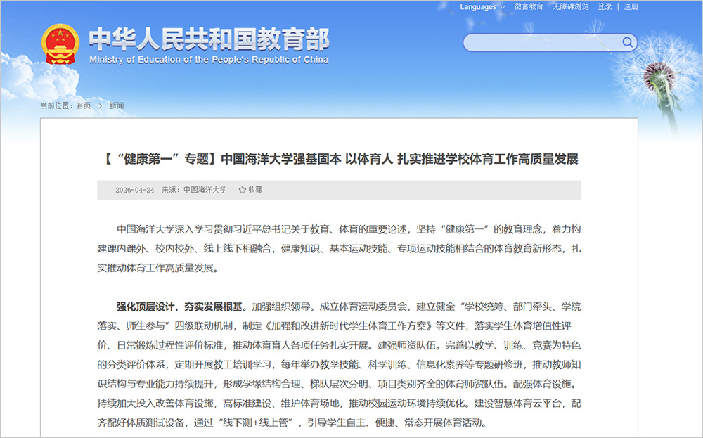 【编者按】近日,教育部官网以《中国海洋大学强基固本 以体育人 扎实推进学校体育工作高质量发展》为题,专题报道了学校深入学习贯彻习近平总书记关于教育、体育的重要论述,坚持“健康第一”的教育理念,着力构建课内课外、校内校外、线上线下相融合,健康知识、基本运动技能、专项运动技能相结合的体育教育新形态,扎实推动体育工作高质量发展的实践经验与做法。全文如下: