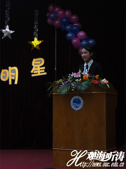 常蕾(海洋生物资源与环境2011级,以下简称11海资)率先登台展示。初中时,她便一直憧憬着成为一名生物学家,高中更曾获得省级生物竞赛三等奖,为选择大学专业埋下伏笔。因为爱它,所以一直全力以赴。思想综合测评全优、学习优秀奖学金、国家奖学金无一不是她大一优秀成绩的证明,当被水产副院长温海深问及如何处理生活与学习的矛盾时,她的回答处处体现——这是一个全身心投入学习的女生。对此,张珊珊(水产养殖2009级二班,以下简称09水养2)也十分赞同,“学习才是大学的王道。”她说到。