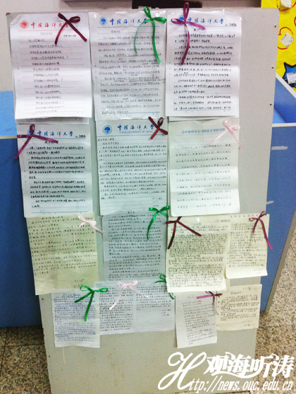早在军训的前段时间,地学院心理协会曾为教师节组织一次新生征文活动,以新生的眼光为老师的节日庆祝。在今晚,这些征文均被摆在了展板上,共同期待教师节来到时学院工作的老师可以体会这些心意。