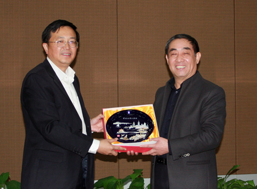 吴德星校长(右)代表学校向高忠文主任赠送纪念品