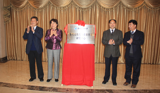 葛华(左二)、刘士祥(左一)、张柳华(右二)、王剑敏为海大高校后勤人力资源管理研究中心揭牌