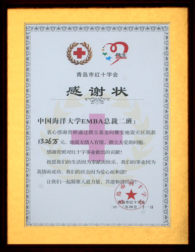4月21日下午,中国海洋大学EMBA课程总裁高级研修班二班学员为四川雅安地震灾区捐款13.26万元。4月23日,学校退休教授张炳根、赵玉芝为灾区捐款5000元,年届92岁高龄的李爱杰老先生也在家人的陪同下来到离退休干部工作处,捐款600元。据了解,张炳根、赵玉芝、李爱杰等老教授在5·12汶川大地震中积极捐款,在学校的“慈善一日捐”活动中也曾慷慨解囊,并热心参与各项公益活动。学生社团也组织了为震区群众祈福的活动,得到了学校师生的积极响应。
