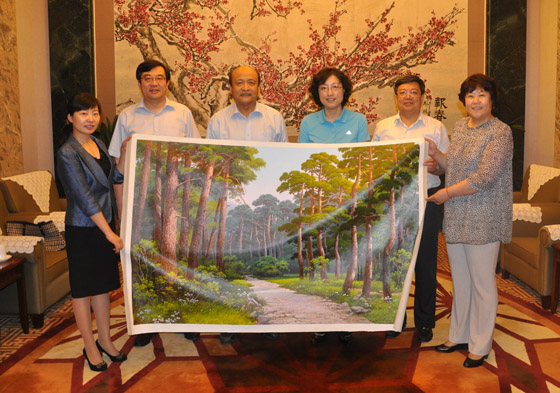 会议期间,冯瑞龙会长、党委副书记张静还专程看望了在威海的部分校友代表,并转达了学校师生对他们的问候和良好祝愿。校友代表张惠表达了对母校的关心之情,并向学校校友会赠送了一幅以森林为主题的油画,祝福校友和在校生能早日成长为参天大树,成为国家的栋梁之才。