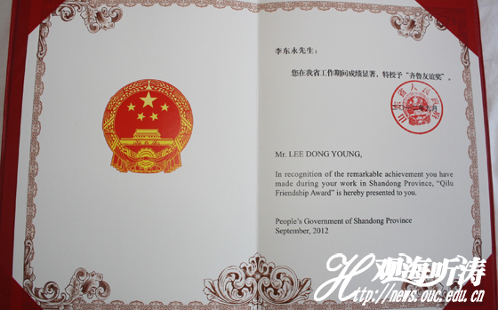 海大外国专家李东永教授喜获2012年度“齐鲁友谊奖”