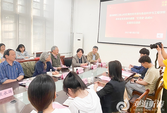 本站讯 5月27日,海大鱼山校区夏花盛放,六二楼前清风徐徐。在学校离退休党委、校关工委、食品科学与工程学院党委的策划下,鱼山校区退休教职工第四党支部的老党员们来到食品科学与工程学院,和学院本科生党支部开展支部共建暨“忆党史 话初心”主题党日活动。