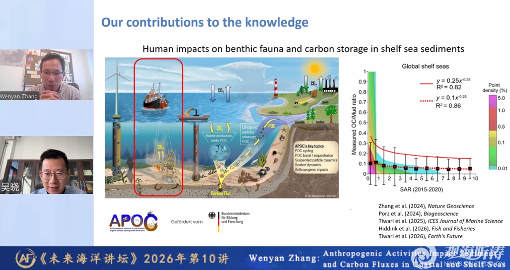 本站讯4月13日,应未来海洋学院院长李建平教授邀请,德国亥姆赫兹Hereon海岸系统研究中心Wenyan Zhang研究员做客“未来海洋讲坛”,作题为“Anthropogenic Activities Impact Sediment and Carbon Fluxes in Coastal and Shelf Seas(人类活动对陆架海沉积物输运和碳埋藏的影响)”的学术讲座。未来海洋学院导师吴晓教授主持讲座,包括未来海洋学院学员在内的共计1.5万余位听众参与了讲座。Wenyan Zhang研究员介绍了人类活动对陆架海有机碳埋藏的影响,主要涉及底拖网,疏浚倾倒和海上风电场三类活动。底拖网是全球分布最广的人为海底扰动,会导致大量泥沙和沉积有机碳再悬浮。以北海为例,底拖网每年约造成100万吨二氧化碳排放。疏浚倾倒是指将...