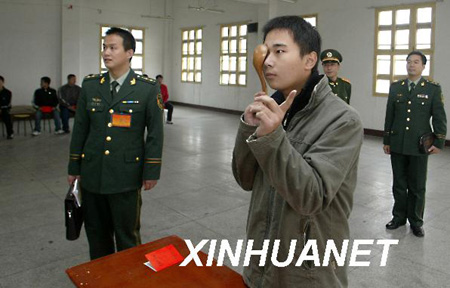 资料图片:2007年11月1日,一名应征青年在检测视力。当日,2007年安徽省暨合肥市征兵体检开始,