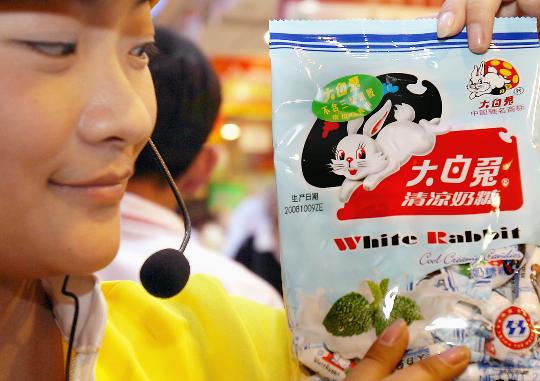 10月16日,上海南京东路的第一食品商店内,销售人员在展示外包装贴有绿色标签的“新版