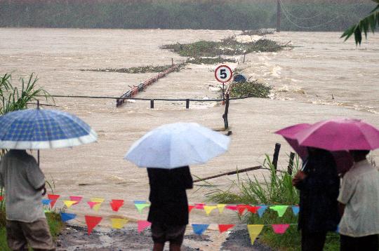 10月13日,万泉河水暴涨,琼海市的一座河上便桥被洪水淹没。10月13日,琼海市大雨滂沱,街道上行人
