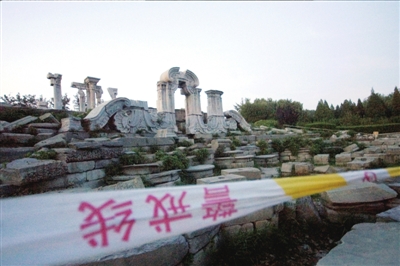 圆明园大水法景区拉上警戒线 禁止游人攀爬遗址