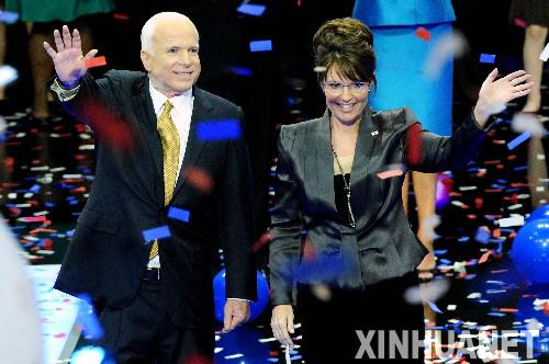 9月4日,美国共和党总统候选人、亚利桑那州国会参议员麦凯恩(左)和他的竞选搭档、阿拉斯加州女州长佩林