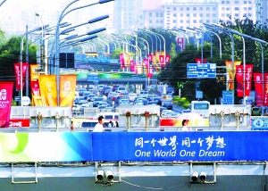 环路上的人行过街桥两侧挂起了迎接北京奥运会的宣传牌