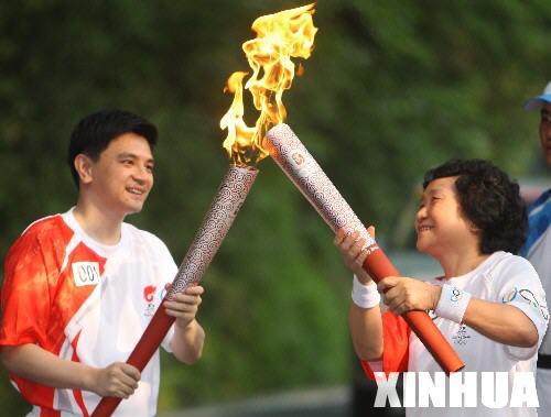 6月4日,第一棒火炬手熊倪(左)与下一棒火炬手卢光琇交接。当日,北京奥运圣火