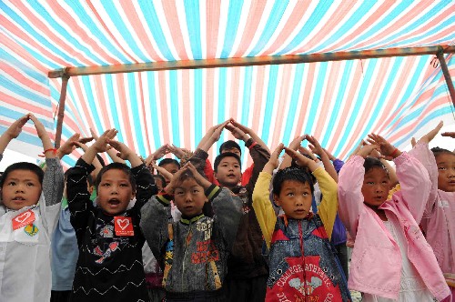 5月29日,四川省什邡市洛水镇的孩子们在为迎接“六一”儿童节排练节目。经历汶川地震的孩子们,面对