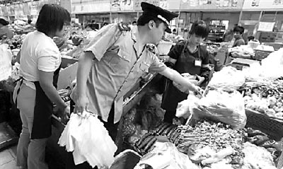 昨天,西城展览路工商所执法人员在地球村菜市场暂扣了几十个超薄塑料袋。 本报讯 昨天是全国实行“限塑
