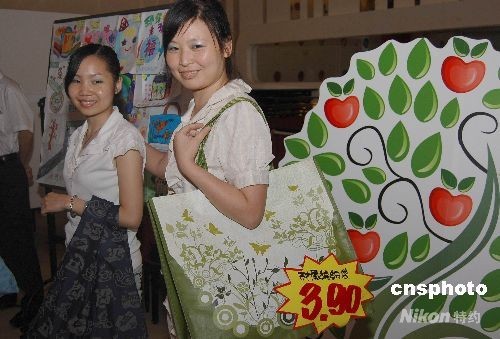六月一日起,广州各大超市停止向顾客提供免费塑料袋,广州家乐福推出新颖时尚的环保购物袋。 中新社发 柯