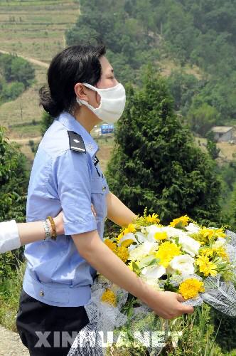 5月26日,蒋敏手捧花环面对北川县城废墟悲痛万分。汶川大地震发