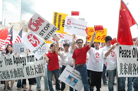 华侨华人聚集在CNN位于旧金山的办公楼前举行抗议示威,要求CNN为卡弗蒂的辱华言论道歉。